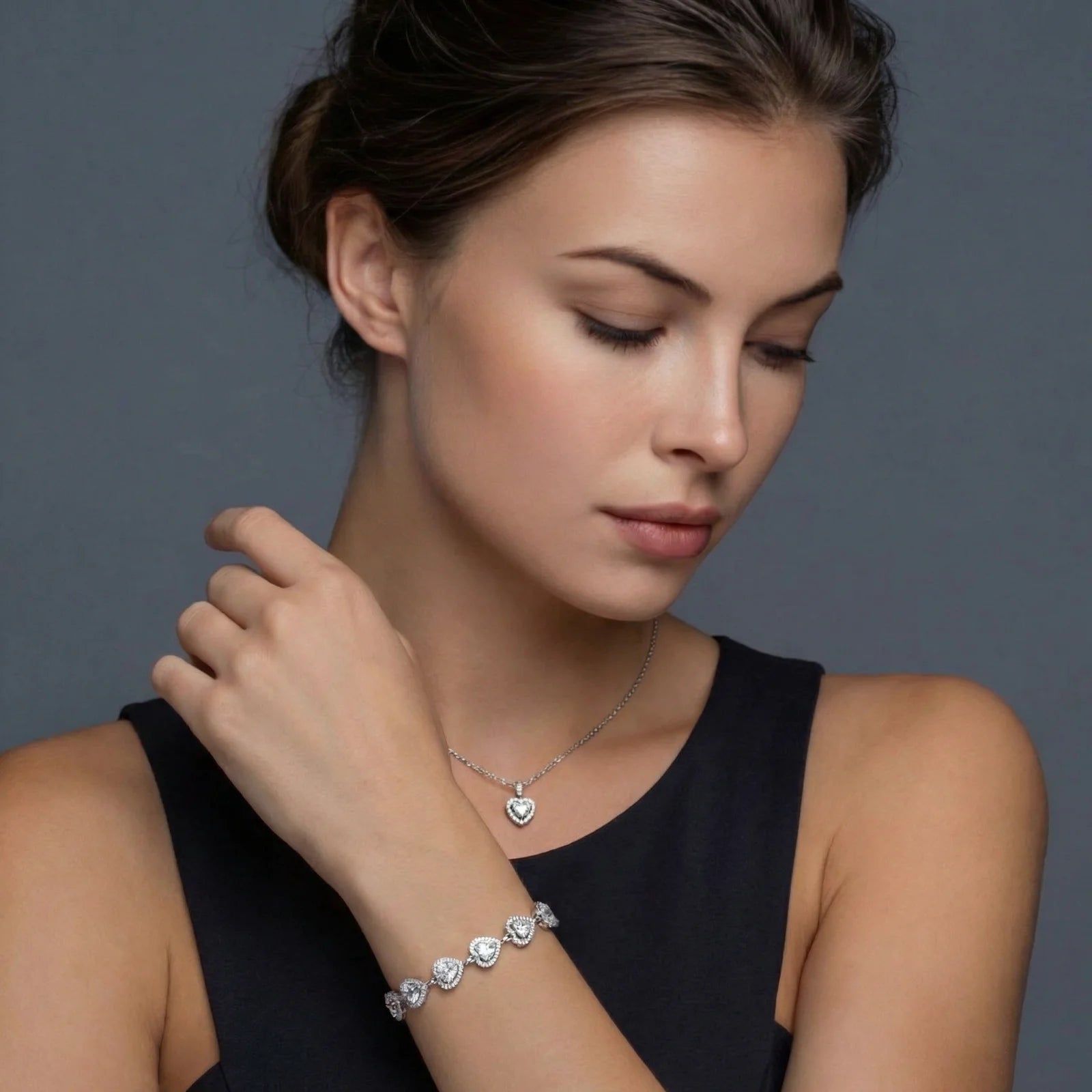 Complete jewelry set with heart-shaped sterling silver pieces featuring brilliant moissanite stones on white background.