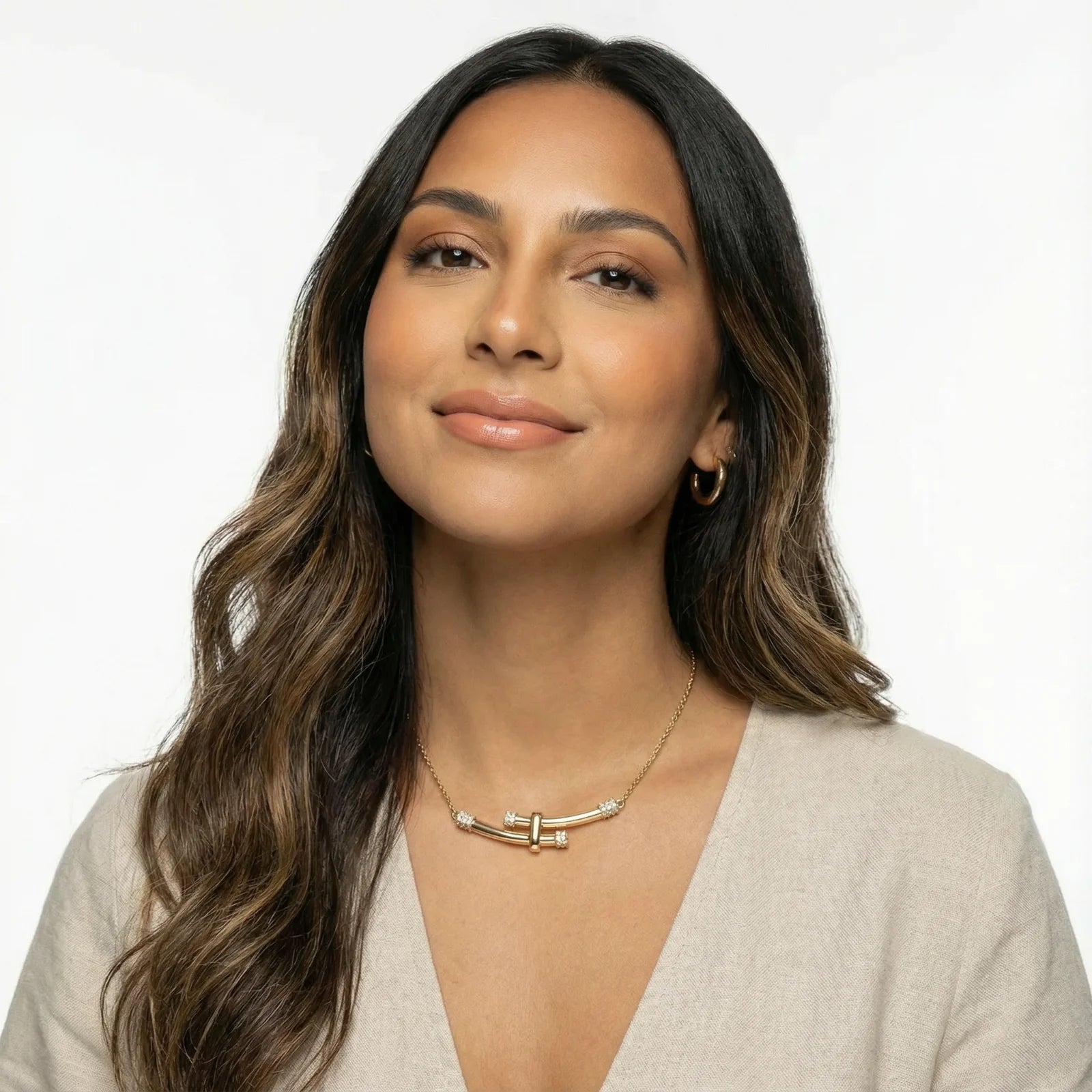 Elegant 14K gold plated necklace featuring two curved bars with diamond accents on adjustable chain